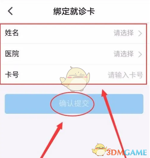 4、输入姓名、医院和就诊卡卡号,点击确认提交。