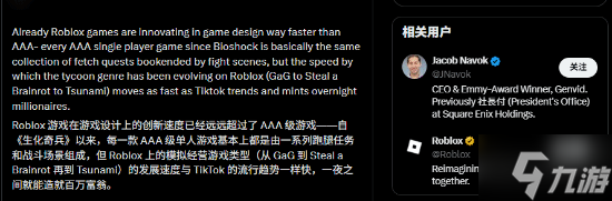 雅各布·纳沃克(Jacob Navok)曾任 Square Enix 商务总监,现为 Genvid 首席执行官。近日他在社交平台上谈到游戏行业的未来时表示,像《Roblox》这样的游戏创作平台,可能正在重塑整个产业格局。