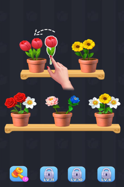 融合园艺美学与消除逻辑,场景中呈现蔷薇、木槿等真实花卉品种。玩家需调整盆栽内花朵位置,确保每组容器仅容纳单一花种。该机制强调目标导向操作与手眼协调性,关卡数量充足,难度曲线平缓,兼顾新手入门与长期留存需求。