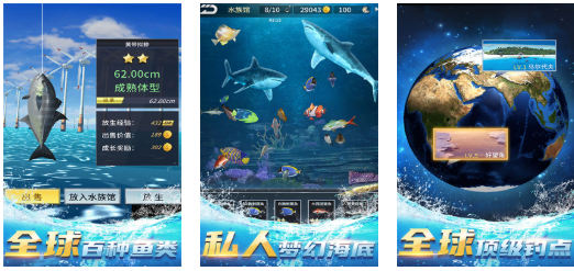 本作采用俯视角卡通渲染风格,融合航海探索与模拟经营双主线。玩家驾驶渔船前往六大主题海域,每个区域具备差异化洋流、水深与鱼群习性。钓具系统包含基础装备与进阶改装件,支持技能树式成长路径;任务系统引导玩家挑战巨型目标鱼,并同步解锁水族馆模块,实现捕捞—展示—培育闭环。场景美术强调色彩层次与动态构图,兼顾轻松娱乐性与硬核垂钓逻辑。