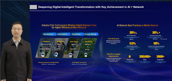 无线网络智能体已覆盖20万站点、100万小区,助力超2000名网络工程师,将AI+网络全面融入生产流程。