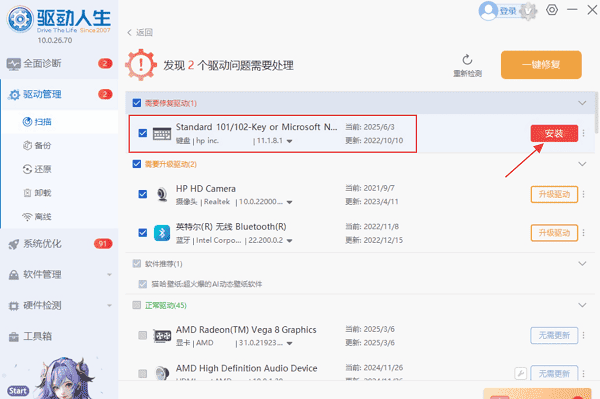 3. 在扫描结果列表中找到“键盘”选项,点击旁边的“一键修复”或“安装”按钮。