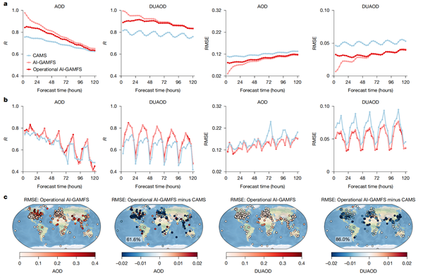该模型在全球61.6%的站点上气溶胶光学厚度预报误差低于欧洲中期天气预报中心哥白尼大气监测服务(CAMS),86.0%的站点上沙尘光学厚度预报表现更优。