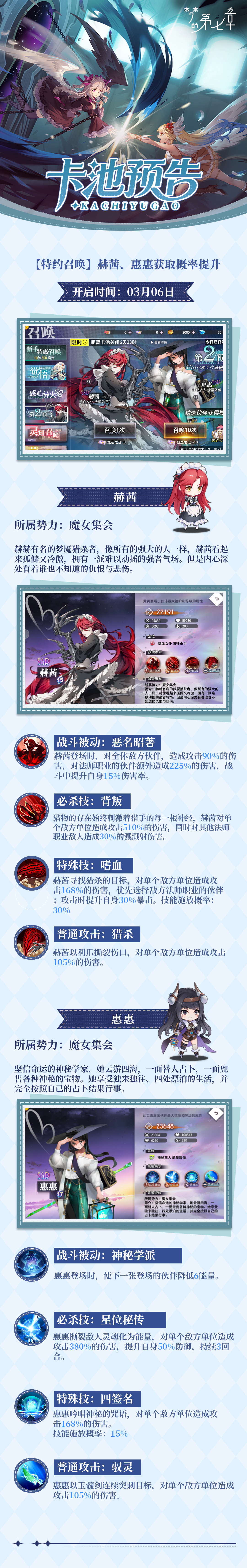 《梦的第七章》限时活动星光应援开启,为喜欢的伙伴应援投票吧,参与活动赢时魄宝箱等超值奖励!SP伙伴只影·赫茜限时召唤,新时装艾恩-暴力美学、杜梅瑟-瑰夜邀约登场,下面就一起来看看具体活动内容吧!