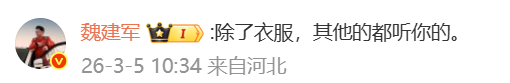 在该微博的评论区,魏建军本人现身回应:“除了衣服,其他的都听你的。”