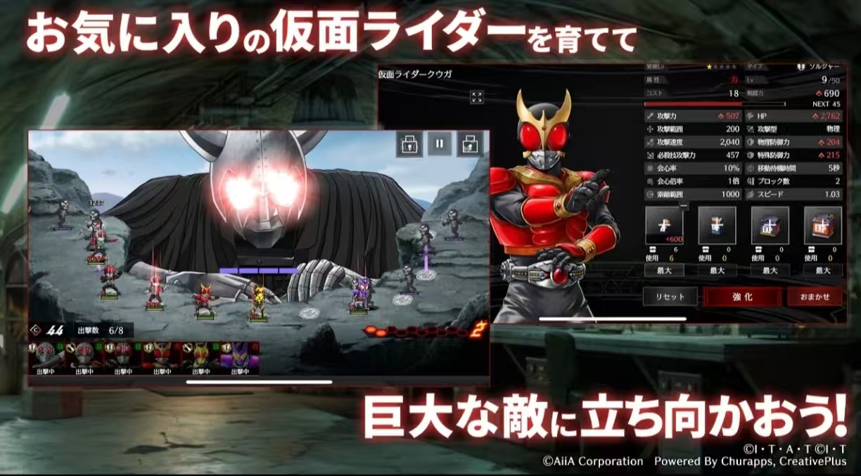 以多代假面骑士集结为背景,收录空我、龙骑、剑、响鬼等系列代表角色。采用半自动塔防式战斗框架:玩家部署骑士于战场节点,依据敌人波次特性调整站位与技能释放节奏;每名骑士拥有专属必杀技CD机制与属性克制关系(火/冰/雷/光/暗),章节任务含限时救援、Boss压制、形态突破等差异化目标。