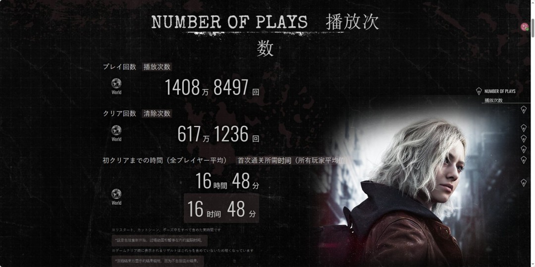 统计页面显示,截至目前,全球玩家累计游玩次数达1411万7223次,通关次数达619万5028次,平均首次通关时间为16小时48分钟。