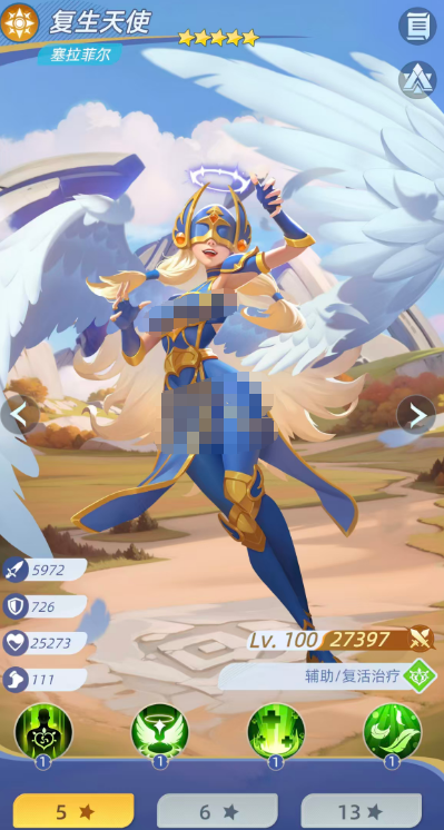 治疗与辅助核心选择复生天使:作为圣光系专属辅助,其复活类效果极为突出——基础复活生命值提升至308%,后期强化后可达441%,且额外赋予被复活单位伤害减免效果。此外,她可清除当前生命比例最低目标身上的3个减益状态;回合结束时,为己方生命值最低的3名单位恢复相当于自身攻击力68%的生命值,实现多段、定向、高覆盖率的续航保障。