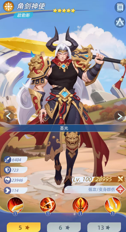 主C位推荐角剑神使:其核心技能“破军”可对全体敌人造成100%物理伤害,且伤害值的5%转化为自身生命;该效果随角色等级提升至140%伤害,并同步将转化比例提高至45%,同时削减目标25%怒气值——这一机制使其成为圣光队中不可替代的怒气封锁手。被动“天神下凡”在生命低于50%时触发,立即解除控制、驱散全部负面状态并恢复20%生命,随后进入持铭剑神形态,为全队圣光单位附加“圣光号令”,并提供常驻20%伤害减免,显著强化团队整体承伤能力。