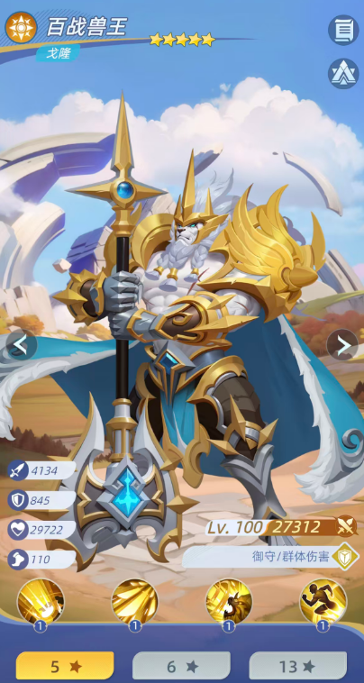 前排坦控双修角色选用百战兽王戈隆:其群体伤害具备成长空间,且拥有50%概率使目标降低伤害;释放技能前自身暴击率提升20%,普攻转为对敌方全体造成40%物理伤害,并附带40%概率减速效果。更关键的是其被动复活机制——当受到致命伤害时,以自身最大生命值20%的比例复活,并获得15%攻击提升,为队伍提供关键的第二波输出窗口与战术延续性。