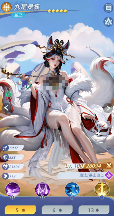第五席位由九尾灵狐担任:作为新上线活动限定角色,其机制高度适配圣光体系。主动技能对生命最低单位造成300%魔法伤害,并附加相当于目标最大生命值10%的真实伤害;暴击时获得1层“神性”,提升50%抗控率、15%伤害与15%减伤。开场即对敌方全体施放120%魔法伤害,并有70%概率附加“黑暗侵袭”,降低全体15%闪避率与25%抗暴率,有效弥补圣光队常规减益覆盖不足的问题。