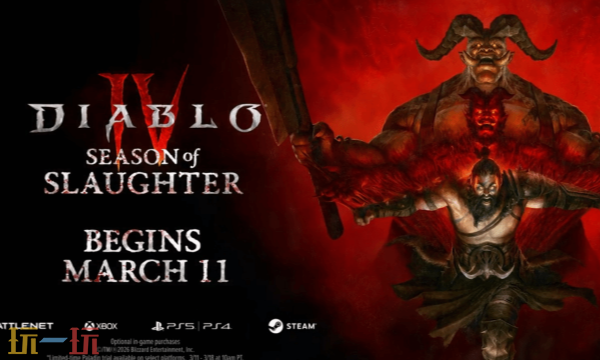 暴雪宣布《暗黑破坏神4》将于3月12日开启”血宴杀戮“新赛季,同步推出与《毁灭战士:黑暗时代》的联动内容。玩家可化身经典怪物屠夫参与全新玩法,并获取限定联动装备。