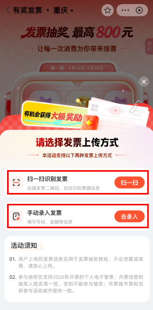 2.点击【传发票 去抽奖】,选择“扫一扫识别发票”或者“手动录入发票”。