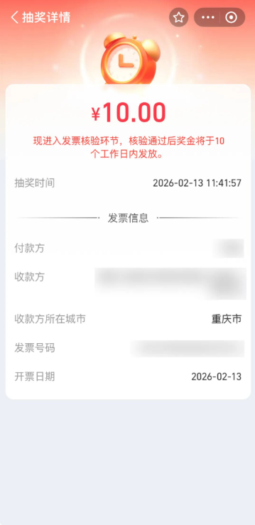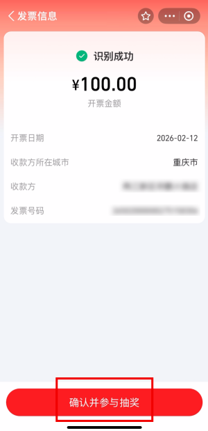 3.发票信息识别或录入成功后,点击【确认并参与抽奖】。