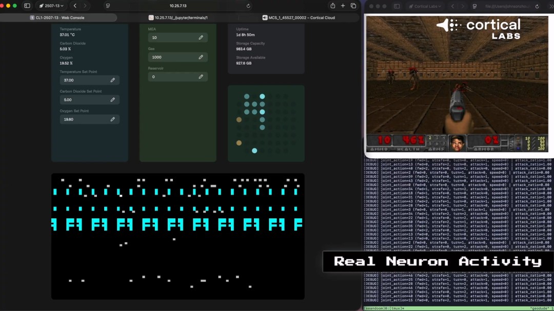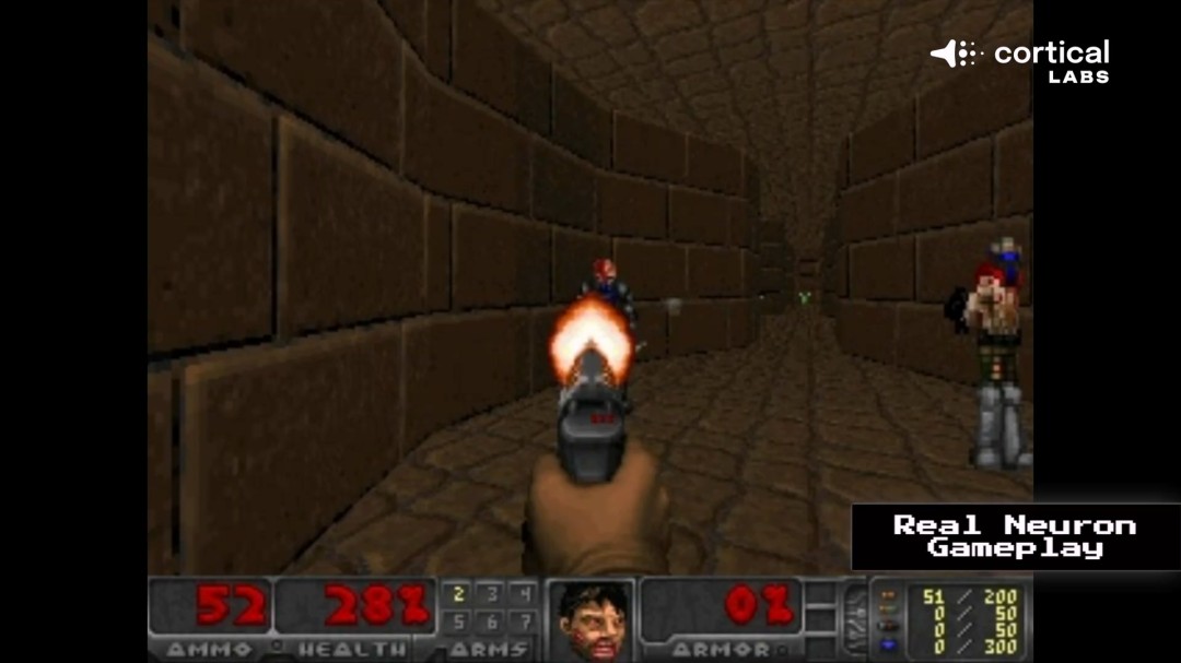 Cortical Labs是在其CL-1神经计算系统上运行《毁灭战士》。这个系统是一块微芯片,上面培养了20万个人类神经元,并连接在一种被称为“多电极阵列”(multi-electrode array)的装置上。此前,该公司曾用类似技术让人类脑细胞在几年前学会玩《Pong》。