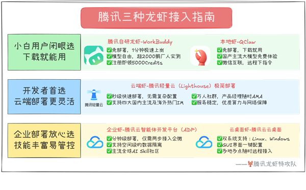 今日,腾讯云发布腾讯全系“龙虾”攻略,无论是小白、开发者还是企业级的部署需求,都有专门的龙虾服务。