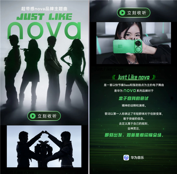 年轻人在生活中大胆展现自我,无论是穿搭个性、兴趣选择,都坚持自己的审美与热爱;在工作中不局限于固有认知,用创新打破平庸。《Just Like nova》的每一句歌词都是年轻人生活态度的真实写照。“New sensation, I love it”唱的是年轻人愿意尝试新方法、学习新技能、解锁新场景的创新;“No hesitation, I drop it”唱的是年轻人不犹豫、不内耗的果决;“So bright, So Shine”传递的是年轻人不被定义的自信;“Run, set, let’s go! I feel it”配合MV中舞者突破框架的肢体语言,将年轻人敢于突破、即刻出发的劲头展现得淋漓尽致。在“Just like nova”的反复吟唱中,nova系列与用户也实现了双向奔赴。