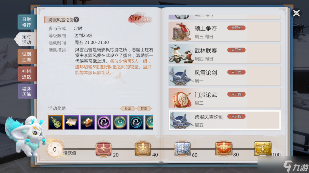 3月12日新版本上线后,每周五21:00-21:30「风雪论剑」将升级为「跨服风雪论剑」,等级达到25级的少侠可以点击游戏内活动提示或者通过【通闻录】→【定时活动】→【跨服风雪论剑】前往参与活动。