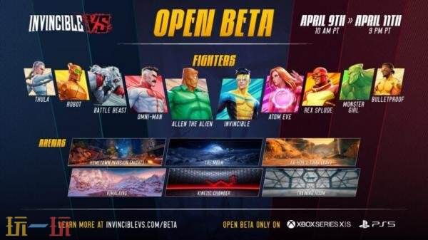 公开测试版将包含 10 个可玩角色——马克·格雷森(无敌)、原子夏娃、防弹、图拉、雷克斯·斯普洛德、战斗野兽、全能侠、机器人、怪物女孩和外星人艾伦——以及六个竞技场——家乡入侵(夜晚)、月球、卡霍尔之墓(白天)、喜马拉雅山脉、动能室和训练室。