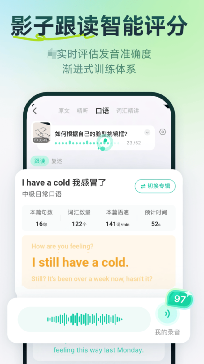 听力练了很久,开口还是磕磕绊绊,这个问题很多人都有。泛听、精听、跟读、复述,六种训练模式把听和说拆开来练,又合在一起用,逻辑上是通的。遇到听不懂的句子,可以用”刮刮卡“获取提示,留了思考的余地。中英字幕,可以随时切换,精听泛听两种状态,随意切换,日常积累和考前冲刺都能用上。