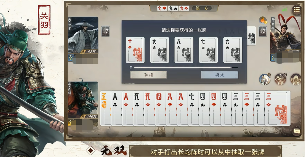关羽所具有的“无双”技能是其压制性能力的重要组成,与“单骑”技能有明显的区别。该技能的触发机制是以对手所使用的长蛇阵技能为基础,当敌人使用长蛇阵技能的时候,可以从中随机抽取一张牌。该策略不但会降低敌人重要的牌张获得的概率,还会对它的整体战术计划产生不利的影响。所抽取的牌张马上被加到关羽的手牌中来,又加深了关羽个人的资源积累和战略优势。