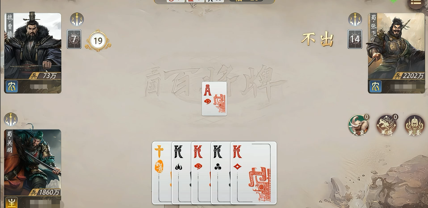 战术角度来说,单骑技能的核心优势就是它的资源循环速度最快。对于很多卡牌游戏来说,在游戏进入后期的时候就会出现手牌储备不足的情况。关羽因为特定阵型的使用而产生的技能会不断产出万能牌,可以解决万能牌消耗过多的问题。尤其是注重阵型搭配的策略模式中,玩家要依靠多张特殊卡牌来达成组合的效果,这时万能牌的使用大大提高了阵型组建的成功率。不但加快了玩家阵型达成的速度,而且给关键阶段提供了更多的战术组合。