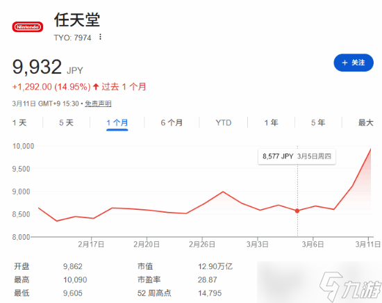 自《宝可梦 Pokopia》上市以来,其累计销量已突破百万大关。值得注意的是,任天堂单只股票价格在此期间显著攀升——从3月5日游戏发售当日的8577日元,飙升至3月11日的9932日元,短短五日累计涨幅高达15%,这一波动幅度远超常规市场表现。