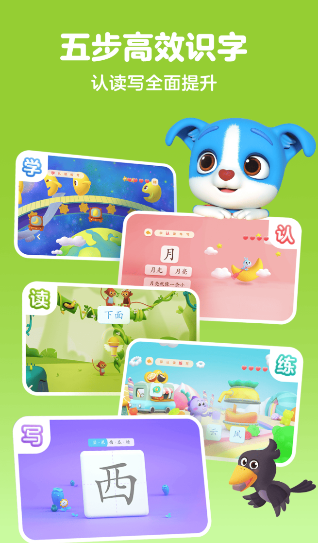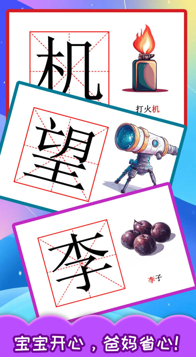 采用“图—音—形—写”四步法,每字均配高清实景插图、标准拼音词组、真人语音领读(由专业播音员录制),培养规范普通话发音习惯。书写环节提供描红临摹模板,笔顺动态演示清晰准确。每个知识点后嵌入趣味性检测小游戏,如连连看、找不同、语音复述等,实现即时反馈与记忆加固。界面布局极简清爽,操作响应灵敏,适配主流安卓机型;支持右滑退出页面,大屏设备自动优化字体大小与按钮间距,低龄儿童独立操作无障碍。