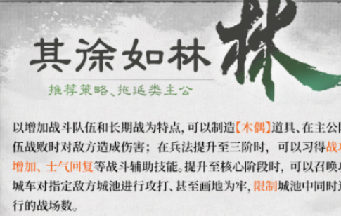 【其徐如林】则走稳健控场路线,聚焦战车体系构建:通过强化战车属性并快速生成木偶诱饵,在我方部队溃退时反向爆发高额伤害。随兵法等级提升,逐步解锁战功加成,同步增强士气恢复、兵力续航等辅助能力;关键阶段可召唤攻城车发起压制性攻坚,配合【画地为牢】技能,有效压缩敌方可部署城池的战场格数,限制其布阵自由度。
