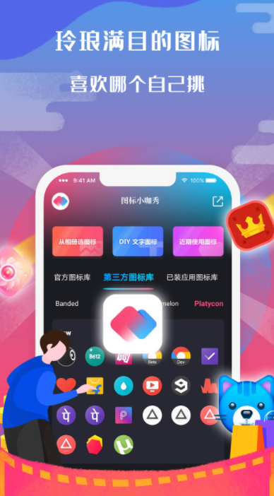 主打深度自定义能力,强调用户原创参与。支持本地图片上传作为图标底图,提供裁切、调色、滤镜等基础图像处理功能,适配单个或整组应用图标。内置简易绘图模块,可添加文字、线条、涂鸦等元素,轻松打造手写风、插画风或抽象风格图标。社区板块聚合大量用户投稿作品,支持整套图标一键下载及互动反馈,形成可持续的内容生态。