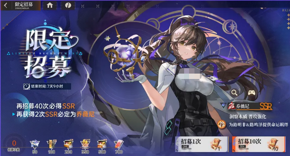 活动核心角色为全新限定SSR伙伴——乔薇尼。她将在活动期间通过「限定招募」系统正式实装,玩家可使用「限定招募券」进行抽取。累计招募达指定次数后,将解锁三档关键奖励:首档为「SSR限定伙伴任选」,次档为「SSR全光暗龙文任选」,末档为专属启灵「真理之瞳」——该启灵仅适配乔薇尼,不可用于其他角色,需在对应阶段主动领取。