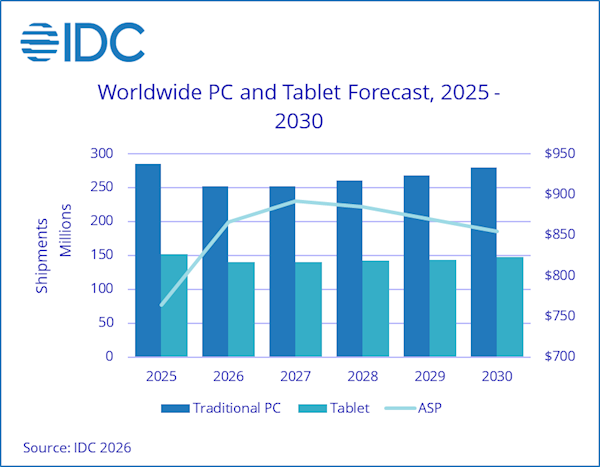 虽然出货量下降,但由于平均售价(ASP)的提升,PC市场2026年将增长1.6%,达到2740亿美元;平板电脑将增长3.9%,达到668亿美元。