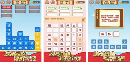 提供“成语接龙”与“成语填字”双模式选择,覆盖多层级难度。在接龙模式中,系统呈现缺字成语(如“画龙点__”),学生需从底部汉字池中选取正确字补全;填字模式则侧重语境理解与词汇积累,适用于语文复习与拓展教学。