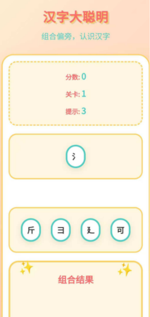 聚焦汉字结构认知,玩法为上下组合偏旁与部首形成规范汉字。关卡逐级递进,从常见独体字延伸至复合形声字。遇到障碍时可启用提示功能,降低挫败感,保障学习连续性,特别适合低年级汉字启蒙阶段使用。
