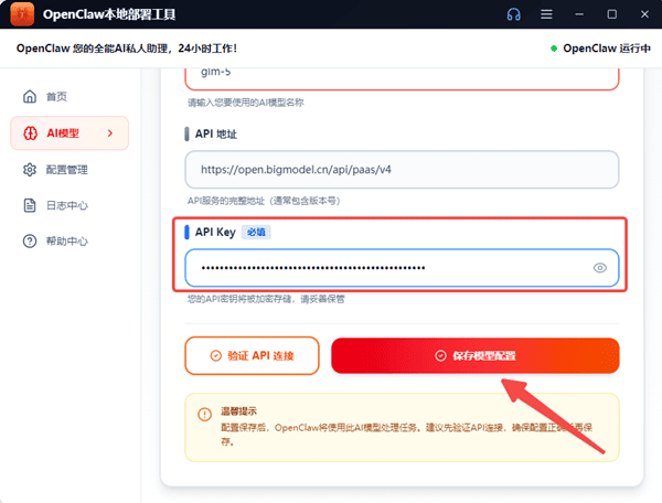 步骤 5:将获取到的API Key粘贴到软件对应位置,然后点击“保存模型配置”。完成后,OpenClaw就具备智能对话能力。