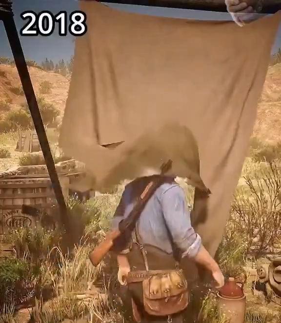 对比而言,8年前的《荒野大镖客2》还是更夯。当亚瑟摩根走过一块布时,这个布有这被头部顶起的动画效果,而且从开始到结束的衔接动画都非常自然。