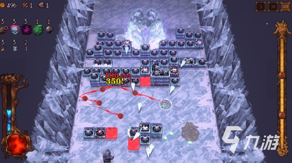 战斗节奏紧凑,敌人沿固定路径持续推进,玩家需实时调整弹道角度与防御阵型。关卡设计包含多个区域切换,最终目标为击败巨型Boss。难度梯度清晰,新手可通过低阶模式熟悉弹珠反射逻辑与建筑协同机制,高阶玩家则可深入钻研弹珠属性克制、建筑联动增益及随机事件应对策略。
