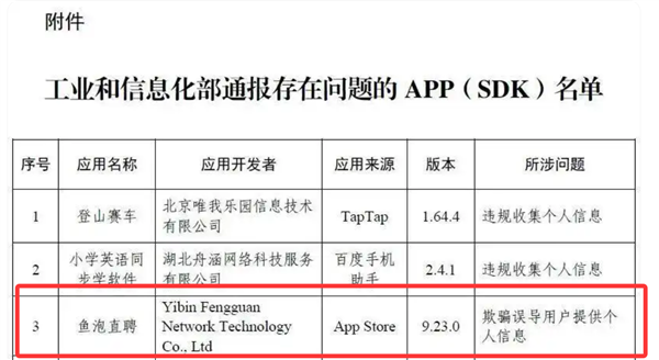 3月15日消息,今日,工信部通报24款存在侵害用户权益行为的App及SDK,鱼泡直聘位列其中。