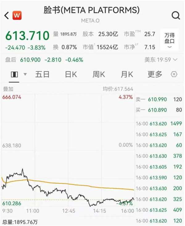 美国科技巨头Meta股价收盘大跌3.83%,单日市值蒸发619亿美元(约合人民币4268亿元),总市值缩水至1.55万亿美元。