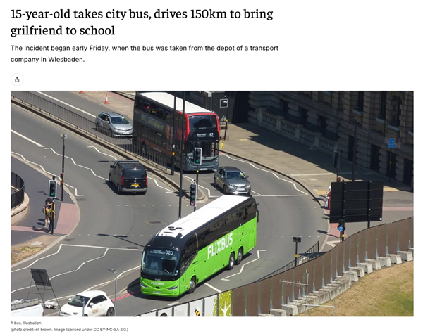 德国15岁少年偷公交车接女友上学:开了130公里后完璧归赵
