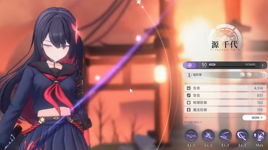 源千代是暗系太刀角色,输出上限是T0里最高的。她的普攻打满五段之后会积累”鬼火“,叠满接重击,斩击倍率很高。她还有个留火区域的机制,站在区域里重击速度提升30%,这个加速效果对输出链影响很大。操作上有个技巧,闪避之后立刻接普攻,可以取消重击的后摇,让输出不断档。这个操作刚开始不太好掌握,但练熟了之后,伤害比普通打法高出不少。