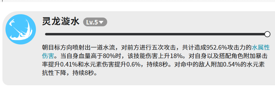 先说它的主力技能,灵龙漩水。这个技能满级之后,朝目标方向喷出一道水流,连续打五下,总伤害能到952.6%的攻击力,属性是水系。有一个条件要注意,就是自身血量保持在80%以上的时候,这个技能的伤害会额外提升18%。所以上场之后尽量别让它掉太多血,保持高血量状态打出来的伤害会更好看。
