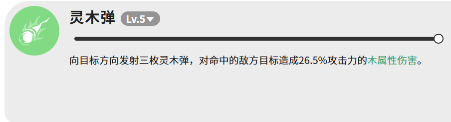 然后是灵木弹,满级状态下,向目标方向发射三枚灵木弹,每枚命中造成26.5%攻击力的木属性伤害。这个技能属于木系,和宝蓝雏龙的双属性对应上了。单次伤害不算高,但胜在能打三下,适合用来补刀,或者打一些需要木属性克制的敌人。