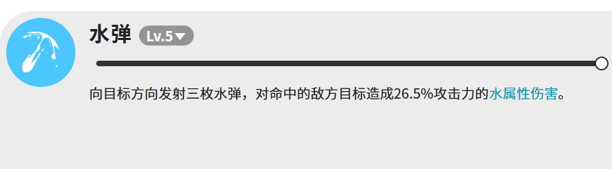 水弹这个技能和灵木弹的结构差不多,同样是发射三枚,命中各造成26.5%攻击力的水属性伤害。两个技能放在一起看,感觉像是一套水木双属性的远程输出组合,可以看敌人的属性弱点,来选择用哪个。