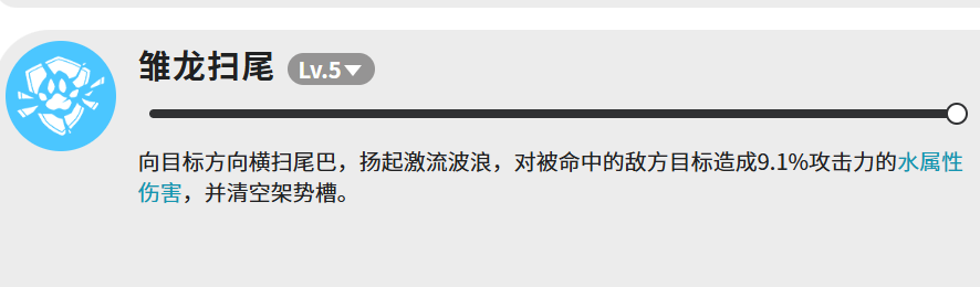 最后是雏龙扫尾,这个技能比较特殊。朝目标方向甩尾巴,带起一波水浪,命中敌人,造成9.1%攻击力的水属性伤害,同时清空敌人的架势槽。伤害本身不高,但清架势槽这个效果,在某些战斗里挺重要的,特别是面对那些,靠架势槽触发特殊状态的敌人,用这个技能打断节奏,还是很有价值的。