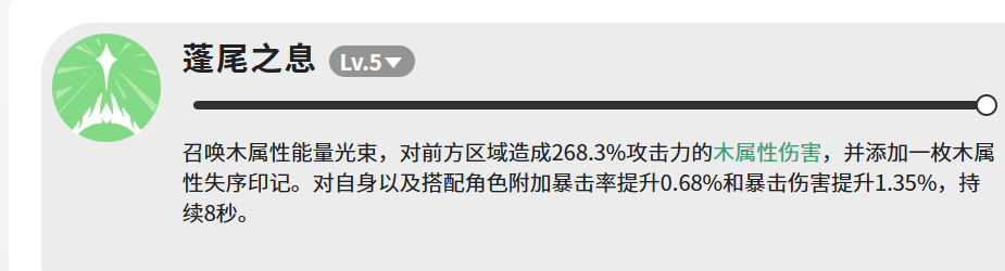 技能方面,先说蓬尾之息。这个技能是召唤一道木属性能量光束,打出去之后对前方区域造成268.3%攻击力的木属性伤害,同时还会附上一枚木属性失序印记。除了伤害之外,它还能给自身和搭配的角色加暴击率0.68%、暴击伤害1.35%,效果持续8秒。单看数值可能觉得加成不算高,但这个技能的价值不只是伤害,失序印记叠上去之后,后续的连招会更顺,整体收益还是有的。