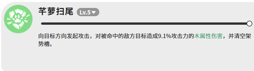 最后是芊萝扫尾,这个技能的伤害不高,只有9.1%攻击力的木属性伤害,但它有一个很实用的附加效果,就是清空架势槽。架势槽清空之后,敌人会进入一段硬直状态,这时候接其他技能的伤害会更高。所以芊萝扫尾不是用来打伤害的,它更像是一个控制手段,用来给后续的输出创造机会。