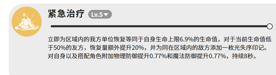 除了回血,这个技能还会给区域内的敌方,添加一枚光失序印记。光失序印记具体能叠多少层、配合什么角色用效果更好,这个要看队伍搭配,小编这里就不展开说了。另外技能还会给自身和搭配角色,附加物理防御和魔法防御各提升0.77%,持续8秒。0.77%听起来不高,但这是叠加在角色本身防御数值上的,打持久战的时候,多少有点用。