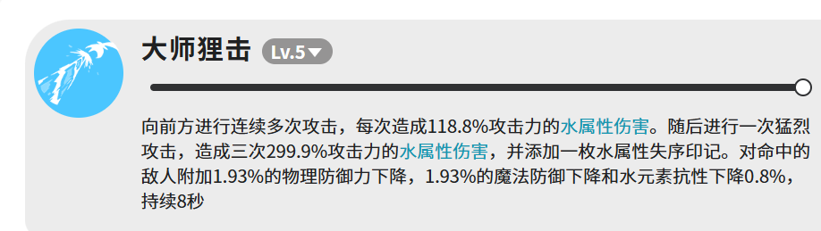 河狸大师属于水属性,种族是异生类里的兽形族,目前处于成熟期阶段,标签是变换。体型中等,但战斗力可不中等。先说技能。大师狸击是河狸大师的核心输出技能。先是一连串的普通攻击,每次打出118.8%攻击力的水属性伤害,节奏很快。打完这一轮之后,紧接着来一次重击,分三下,每下299.9%攻击力,还会附上一枚水属性失序印记。命中之后,对方的物理防御和魔法防御各降1.93%,水元素抗性也会掉0.8%,效果持续8秒。这个技能的价值不只是伤害本身,后面的减防效果才是重点,配合队伍里其他水属性角色用,收益会高不少。