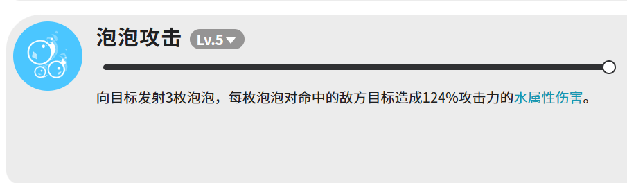 泡泡攻击一次发出三颗泡泡,每颗打出124%攻击力的水属性伤害,三颗全中的话总伤害是372%。这个技能的特点是分散打,如果对面有多个目标,三颗泡泡可能会分开命中不同的敌人,所以打单体的时候要注意一下站位,尽量让三颗都打到同一个目标。